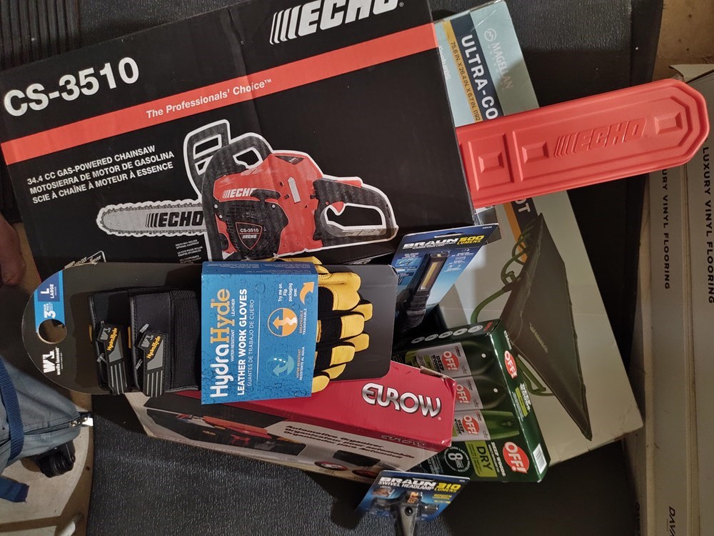 Be ready for any outdoor project with this complete bundle! The centerpiece is a brand-new Echo CS-3510 34.4cc gas-powered chainsaw, trusted by professionals for its power and reliability. For safety and comfort, the package includes HydraHyde leather work gloves, while a Braun 600 lumen flashlight ensures visibility even in low-light conditions. To round it out, you’ll also receive OFF! bug repellent and other handy accessories—everything you need for efficient, safe, and comfortable yard work or property maintenance. ECHO CHAIN SAW CS-3510 34.4CC $300, MAGELLAN ULTRA COMPACT COT $55, EUROW COLLAPSIBLE VEHICLE STORAGE BOX $40, BRAUN HEADLAMP AND BRAUN WORKLIGHT $20, WELLS LAMONT LEATHER WORK GLOVES $40, ‘OFF’ DEEP WOODS REPELLANT 4PK $30