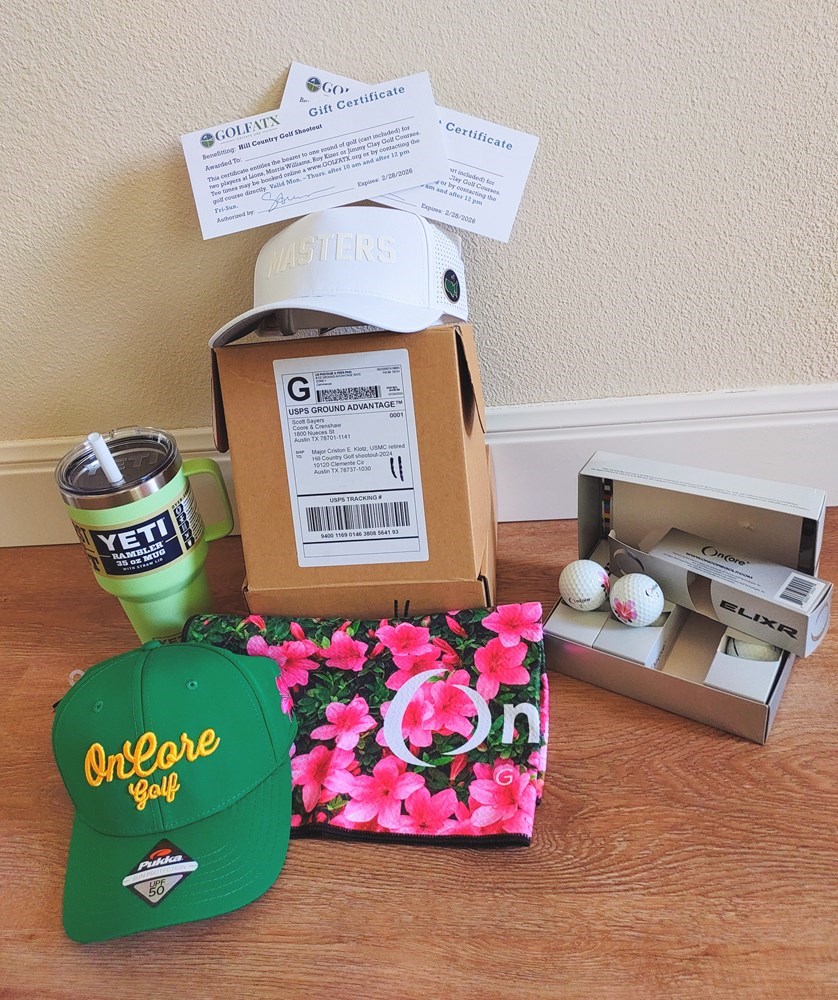 Bring Augusta flair to your game with this golf essentials bundle. Included are a Masters cap, OnCore golf hat, OnCore Elixr golf balls, and a floral OnCore golf towel. A YETI Rambler tumbler keeps drinks cold on the course, while GolfATX gift certificates for two twosomes (or combine them for a foursome) at any ATX golf course. Perfect for the golfer who appreciates both performance and style. BEN CRENSHAW AUTOGRAPHED CAP SENT FROM COORE AND CRENSHAW AS A DONATION $100; AZALEA “MASTERS”: ONCORE GREEN CAP, BALLS, AND TOWEL $80, FOURSOME AT ANY ATX COURSE $250, YETI RAMBLER 35OZ GREEN MUG W/ STRAW LID $42