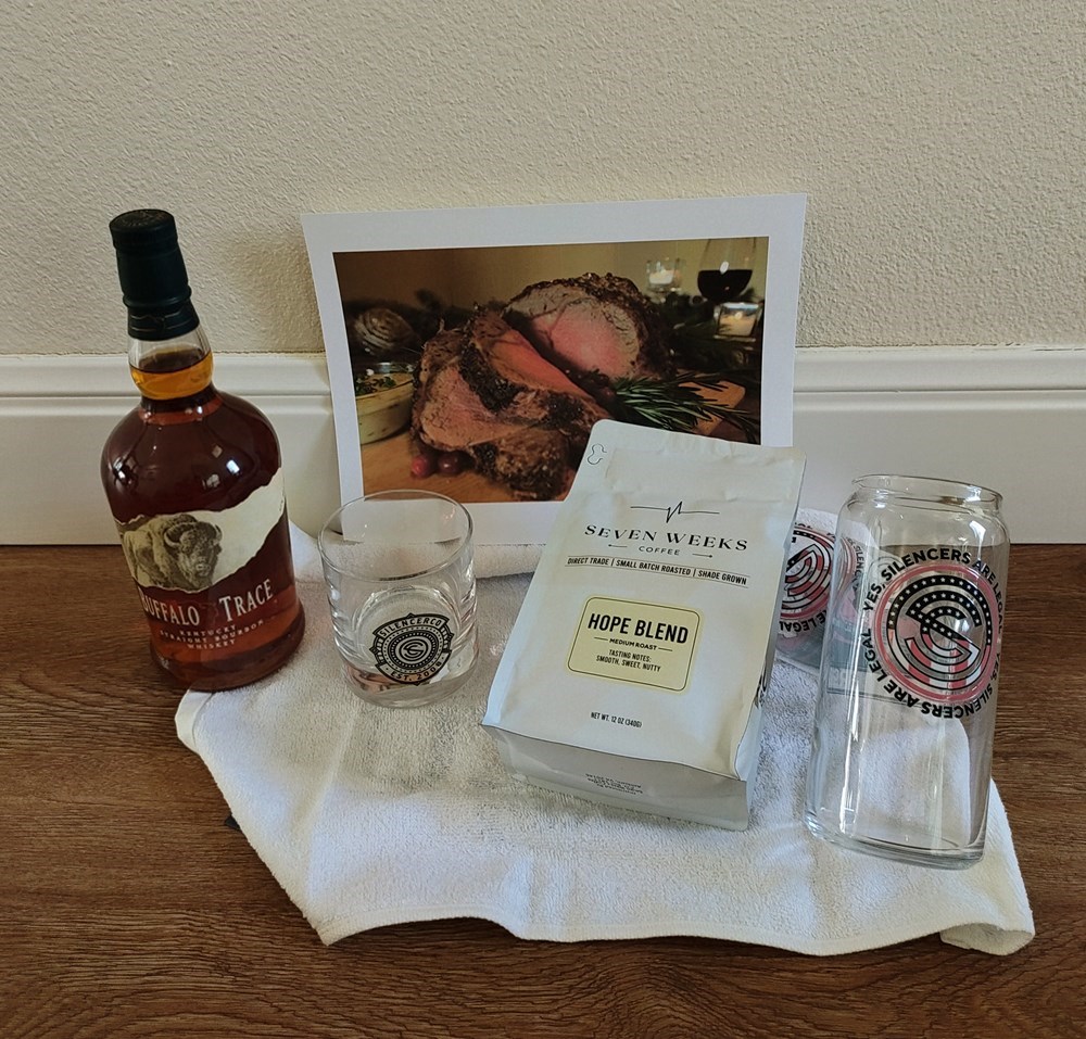 This indulgent package is built for good times and great taste. Enjoy a prime rib dinner (pictured), paired with a bottle of Buffalo Trace bourbon and a case of Twisted X beer. Also included are Seven Weeks Coffee – Hope Blend, two patriotic pint glasses, and a whiskey glass for sipping in style. The perfect bundle for entertaining friends or treating yourself to a true Texas feast. CHRISTMAS PRIME RIB ROAST COOKED AND SEASONED 6LBS $120, BUFFALO TRACE WHISKEY $40, CASE OF TWISTED X $60, SILENCER COMPANY WHISKEY GLASS $20, 2 SILENCER COMPANY BEER GLASSES $40, 12 OZ. BAG SEVEN WEEKS HOPE BLEND COFFEE $20