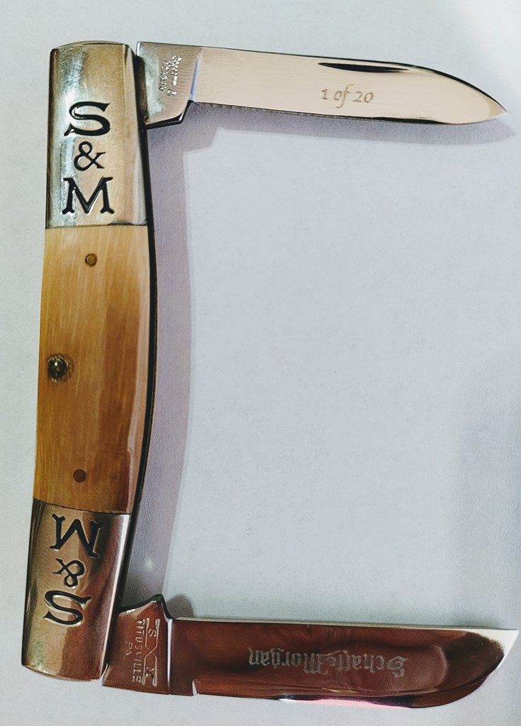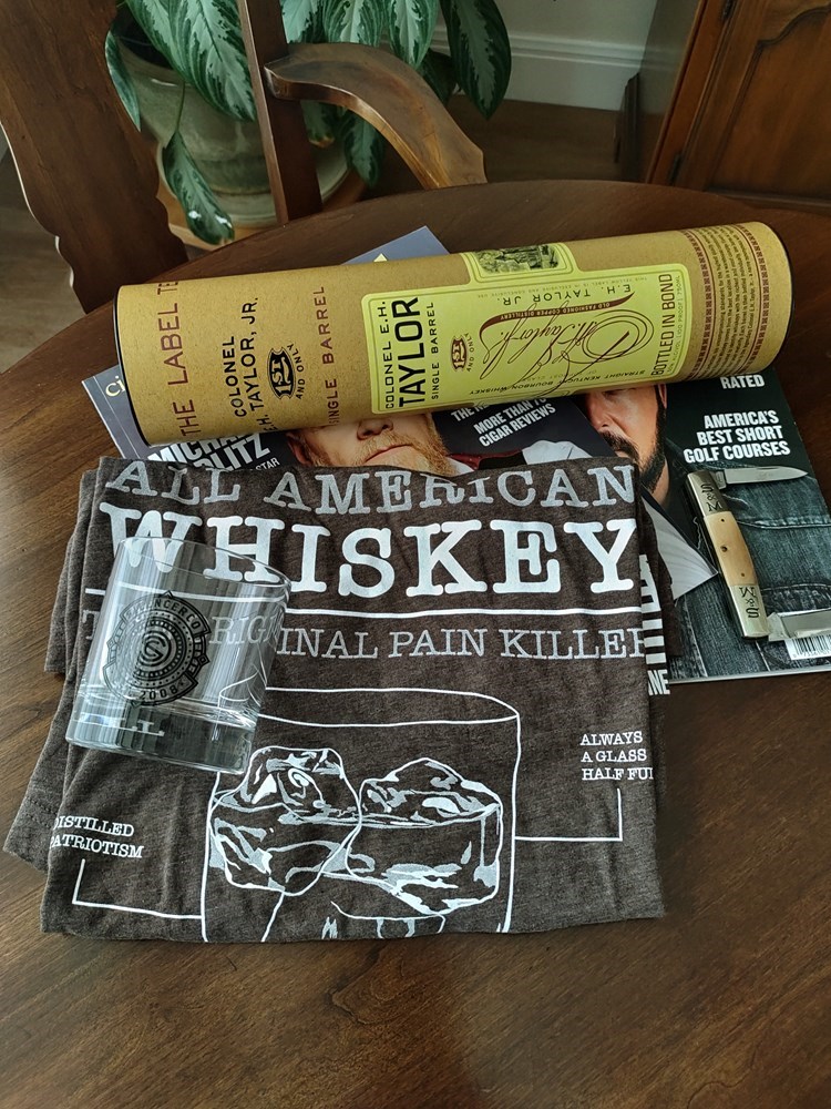 CORRECTION KNIFE BOX SAYS NO 9 , BUT BLADE SAYS 1 OF 20. This exclusive bundle features a bottle of Colonel E.H. Taylor, Jr. Single Barrel bourbon limited release in its signature tube, a true collector’s prize for bourbon lovers. Admire your rare (1 of 20) Schatt and Morgan with Ivory handles. To complement them, enjoy two premium cigars, an All American Whiskey t-shirt, a whiskey glass, and a selection of magazines covering whiskey and golf. A perfect mix of rare spirits and lifestyle extras for the enthusiast who appreciates quality and craftsmanship. WHISKEY EXCLUSIVE COLONEL E.H. TAYLOR SINGLE BARREL LTD. RELEASE $250, ULTRA-RARE SCHATT & MORGAN #32, TWO-BLADE CONGRESS, MAMMOTH IVORY HANDLES, #9 OF 20 $450, TWO PREMIUM CIGARS $50 SILENCER CO. WHISKEY GLASS $20, WHISKEY T-SHIRT $30